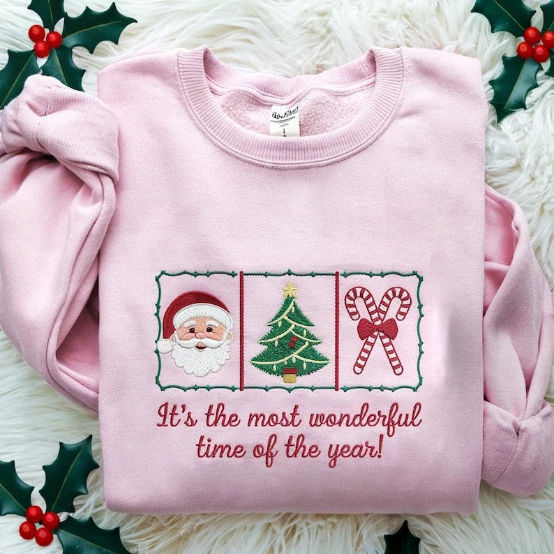 Christmas Retro It's the Most Wonderful Time of the Year Embroidered Sweatshirt, Coquette Frame Red Bow candy cane Gingerbread Xmas Sweater
