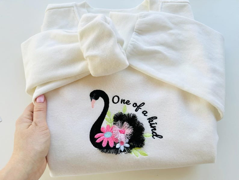 Awesome Black Swan Fringed Fluffy Embroidered Sweatshirt, Fringe Embroidered Sweatshirt, Embroidered Sweatshirt