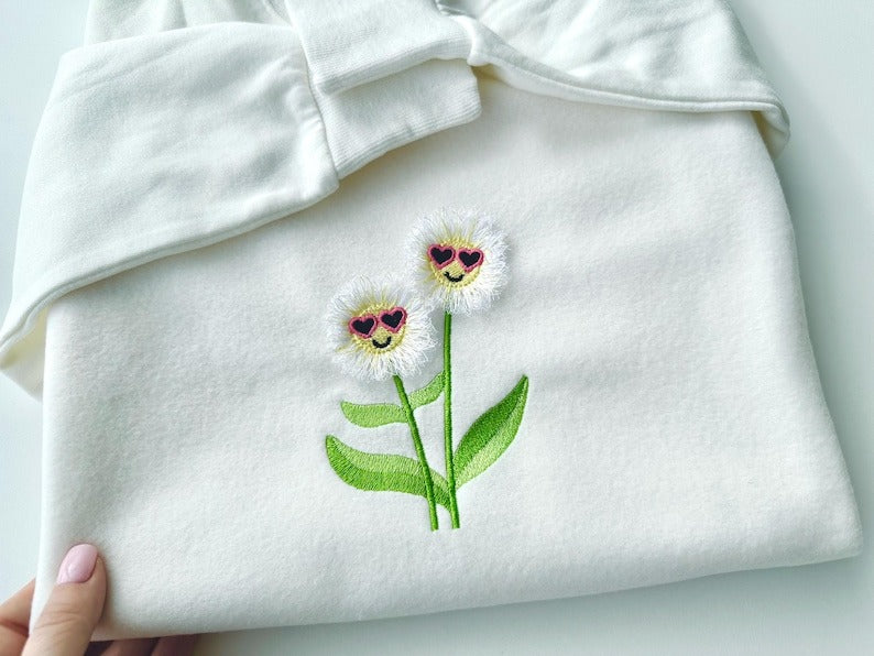 2 Cute Fringed Flower Big Little Sister Fluffy Embroidered Sweatshirt, Fringe Embroidered Sweatshirt, Embroidered Sweatshirt