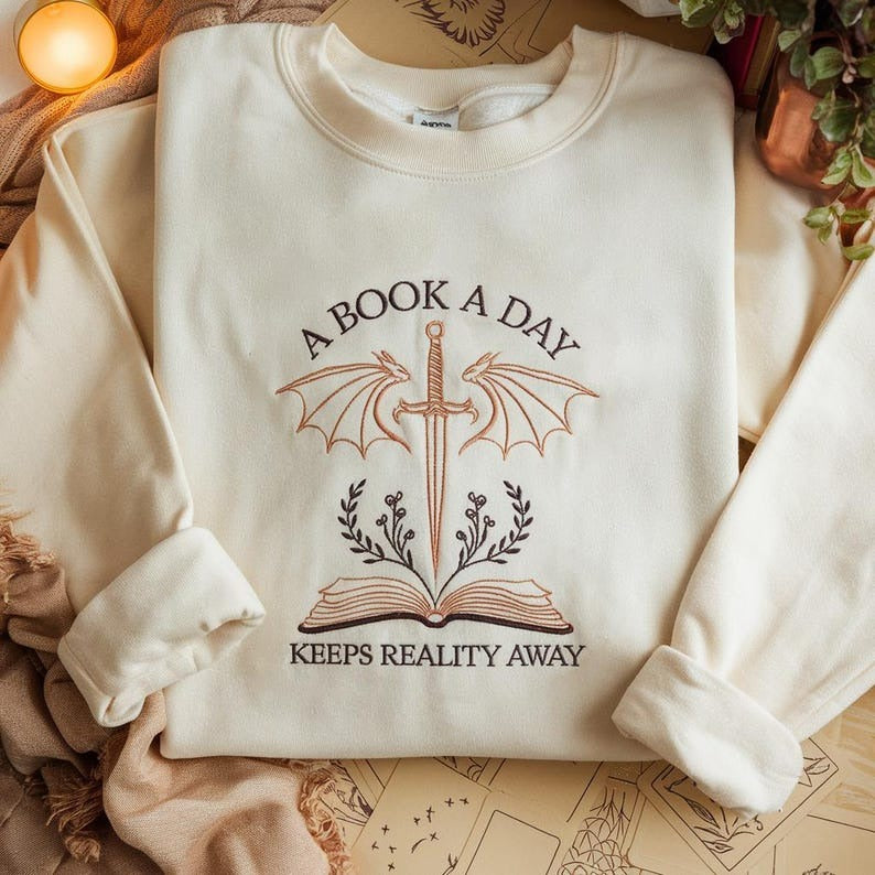 A Book a Day Dragon Embroidered Sweatshirt, Bookish Sweatshirt, A Book a Day Dragon Keeps Reality Away Embroidered Shirt, Fantasy Book Shirt