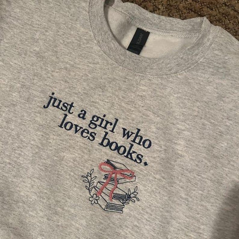 Just a Girl Who Loves Books Embroidered Crewneck Sweatshirt, Just a girl Sweatshirt, Book Lover Crewneck, Coquette Embroidered Sweatshirt