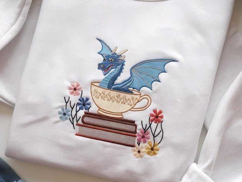 Dragon and Book Tea Embroidered Sweatshirt, Fantasy Reader Sweatshirt, Perfect Literary Gift for Book Lovers & Readers, Fantasy Dragon Shirt
