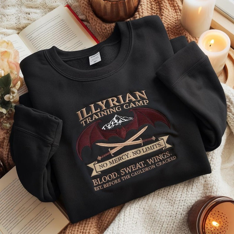 Illyrian Training Camp Embroidered Sweatshirt, ACOTAR Valkyrie Sweatshirt, No Mercy No Limits Wingspan Gift, BookTok Fantasy Sweatshirt