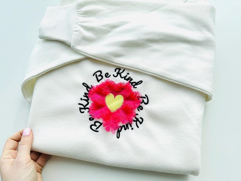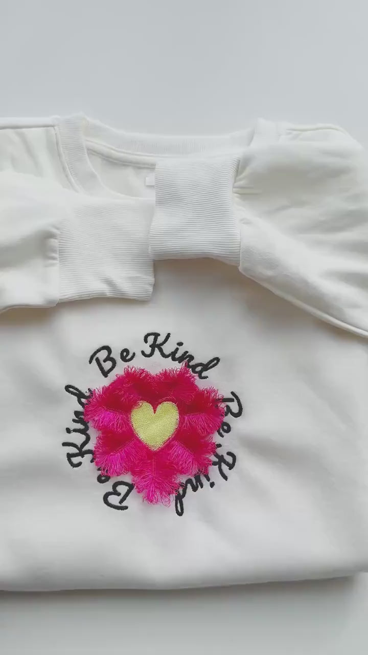 Saying Be Kind with Fluffy Heart Daisy Fluffy Embroidered Sweatshirt, Fringe Embroidered Sweatshirt, Embroidered Sweatshirt